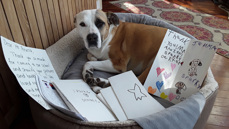 Surrounded by all his "fan mail" from the kids after a school visit.